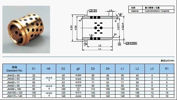 JDB-1U油沟铜套是一种以油沟涌油作为润滑的铜制轴承。产品具有传统的锡青铜轴承功能,由于采用高力黄铜(ZCuZn25Al6)后,它的HB硬度提高了一倍,所以在低速的场合使用该产品,比一般青铜套寿命可以延长一倍,而且其承载压力大,能适应重载的场合使用。该产品是以电解铜为原料配以多种微量金属元素,经高温烧结,通过气压离心铸造加工而成。产品广泛用于纺织机械、注塑机械、矿山机械、工程机械、汽车工业等领域。公司可以根据客户选择中国、德国、日本、美国及其他国家的多种牌号制成铜套、垫圈、滑板、半瓦等产品. 可根据客户要求在其内外壁加工各种油槽及注油孔,亦可来图加工
